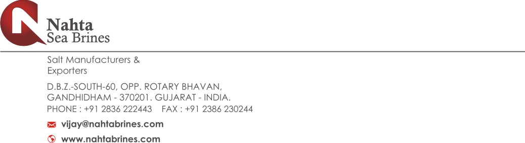 Nahta Sea Brines We take this opportunity to introduce ourselves as "NAHTA SEA BRINES" to your esteemed organisation Found by Mr. Multanmal Nahta in 1968. We are one of the pioneer organisation in manufacturer and suppliers of all kinds of Salt in India for 40 years. Now our organization wants to bridge the gaps between India and all over the world with the shore up of such valuable clients. our time and consistency build loyalty towards our clients. Our production disseminated in 1100 acres with a capacity to produce about 50000 MT. We have built & opted an advanced technology to produce salt as per require ments of our clients. We can move ahead with the association of our valuable clients and we assure you to provide best of our services. salt trade india, coarse salt exporters, crushed salt exporters Nahta Sea Brines is a full-line salt manufacturer. We are one of the largest salt manufacturer in the Kutch Near Kandla and Mundra port. We produce 50,000 tons per year and is expected to reach about 70000 Mt. per annum. Our product lines include agricultural, water softening, consumer, industrial grade and food grade purpose. We have covered all the states in all over the India with our respected & supportive clients. We focus to expand our export acivities.